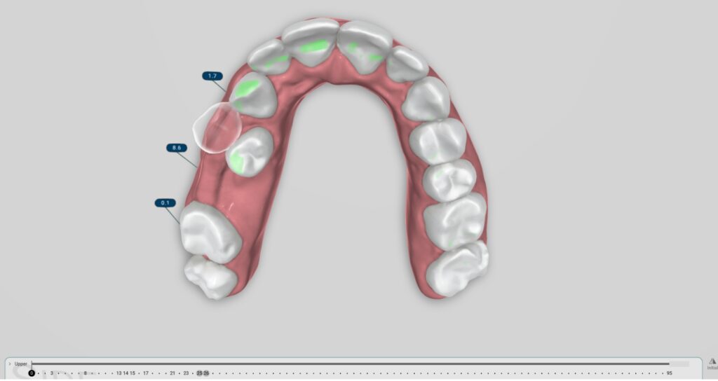 Cyfrowy Plan Leczenia przeanalizowano pod kątem osiągnięcia klinicznego celu zaplanowanego przez lekarza – uszeregowania zębów w celu leczenia implanto-protetycznego. Zaproponowano znaczną modyfikację koncepcji leczenia a co za tym idzie cyfrowego planu leczenia.